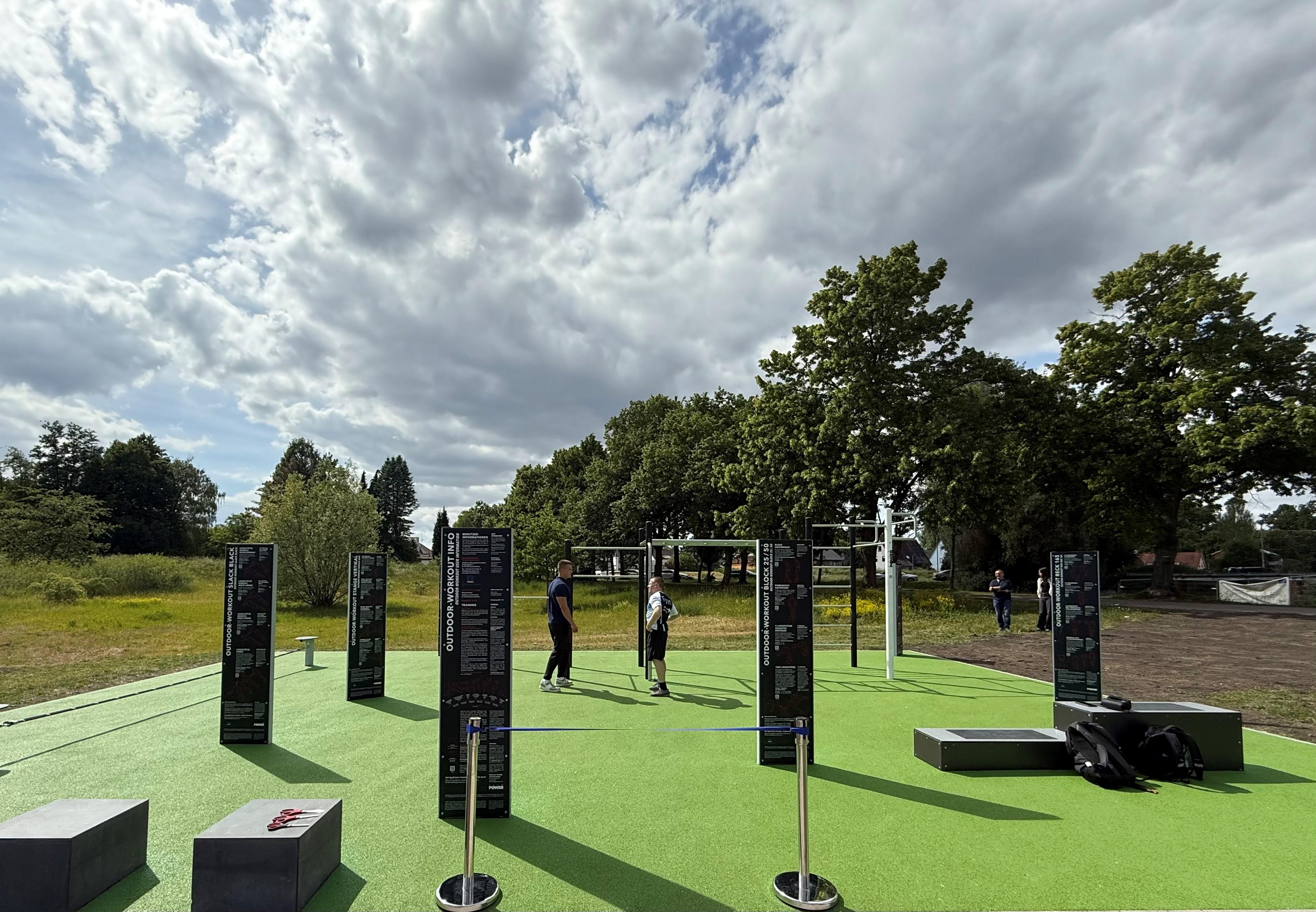 Durch die Calisthenics-Anlage ist nun zusammen mit dem dort bereits vorhandenen Spielplatz ein Mehrgenerationen-Park entstanden, um Menschen aller Altersgruppen zusammenzubringen, ihnen die Freude an der Bewegung und am Sport zu vermitteln und natürlich die Lebensqualität vor Ort weiter zu verbessern. Zu der Anlage gehören ein Großgerät, an dem das Trainieren von Kraft und Beweglichkeit aller Muskelgruppen des Körpers möglich ist. Ergänzend dazu wurde eine Slackline installiert, an der Gleichgewichtsfähigkeit, Orientierungs- und Differenzierungsfähigkeit trainiert werden können, sowie eine Station Squat-Box, an der verschiedene Ausdauerübungen machbar sind. Die Nutzer bringen das entscheidende Trainingsgerät selbst mit – ihren Körper. Mit ihm als Gegengewicht gibt es zahlreiche Übungen an Leitern, Stangen, Hangelstrecken in verschiedenen Größen, Positionen und Höhen sowie an der Sit-up Bank. Die vielfältigen Übungen wie Klimmzüge, Dips (effektive Übung, um Brust, Schultern und Trizeps zu trainieren) oder Liegestütze fördern Kraft, Ausdauer und Koordination.