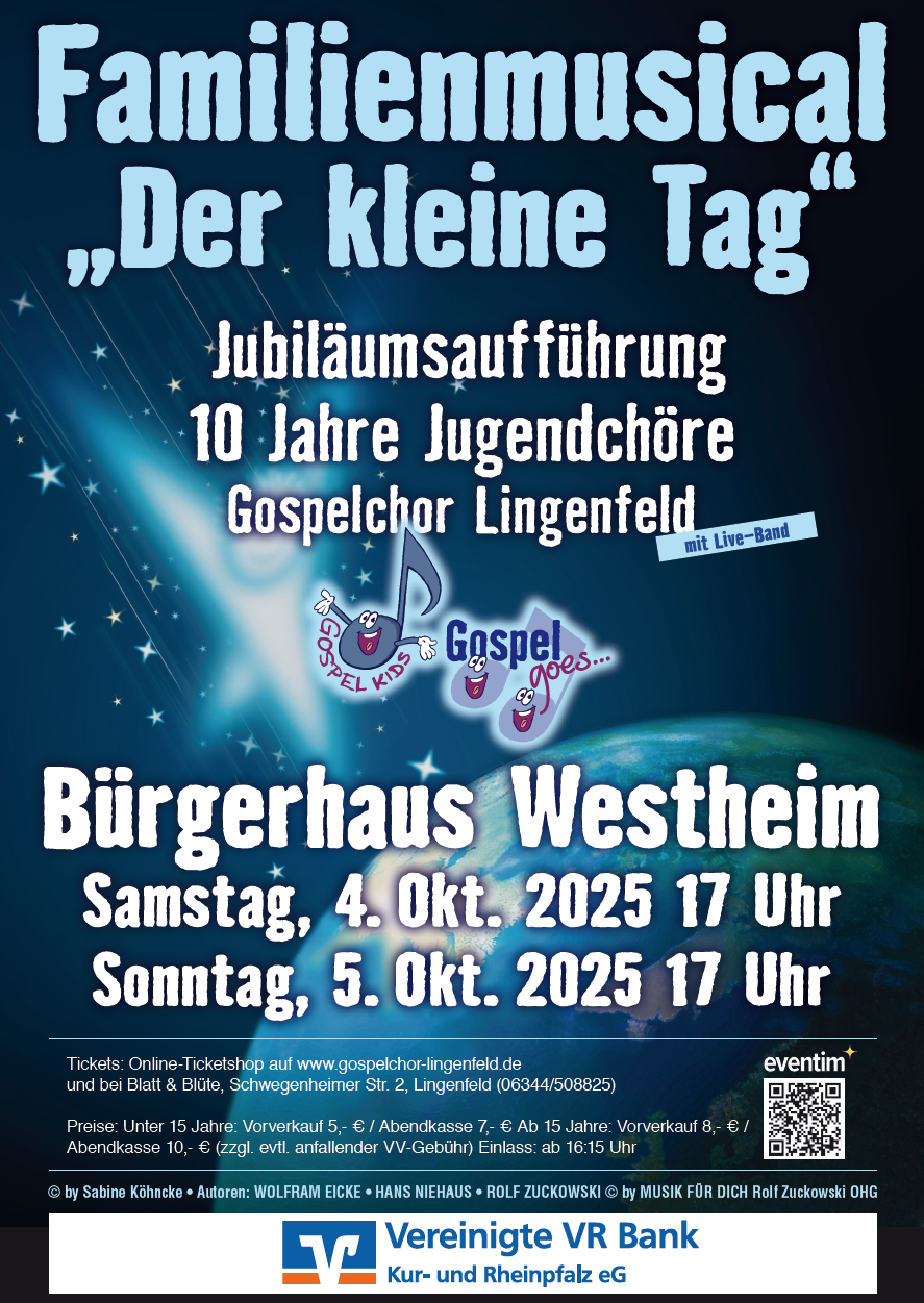 Die beiden Jugendchöre des Gospelchores Lingenfeld, „Gospel Kids“ und „Gospel goes...“, feiern ihr 10-jähriges Bestehen mit dem ganz besonderen Familienmusical „Der kleine Tag“.